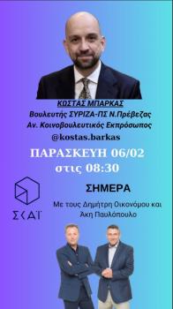 Στην εκπομπή «ΣΗΜΕΡΑ» του τηλεοπτικού σταθμού ΣΚΑΪ τοποθετήθηκε ο Βουλευτής Πρέβεζας του...